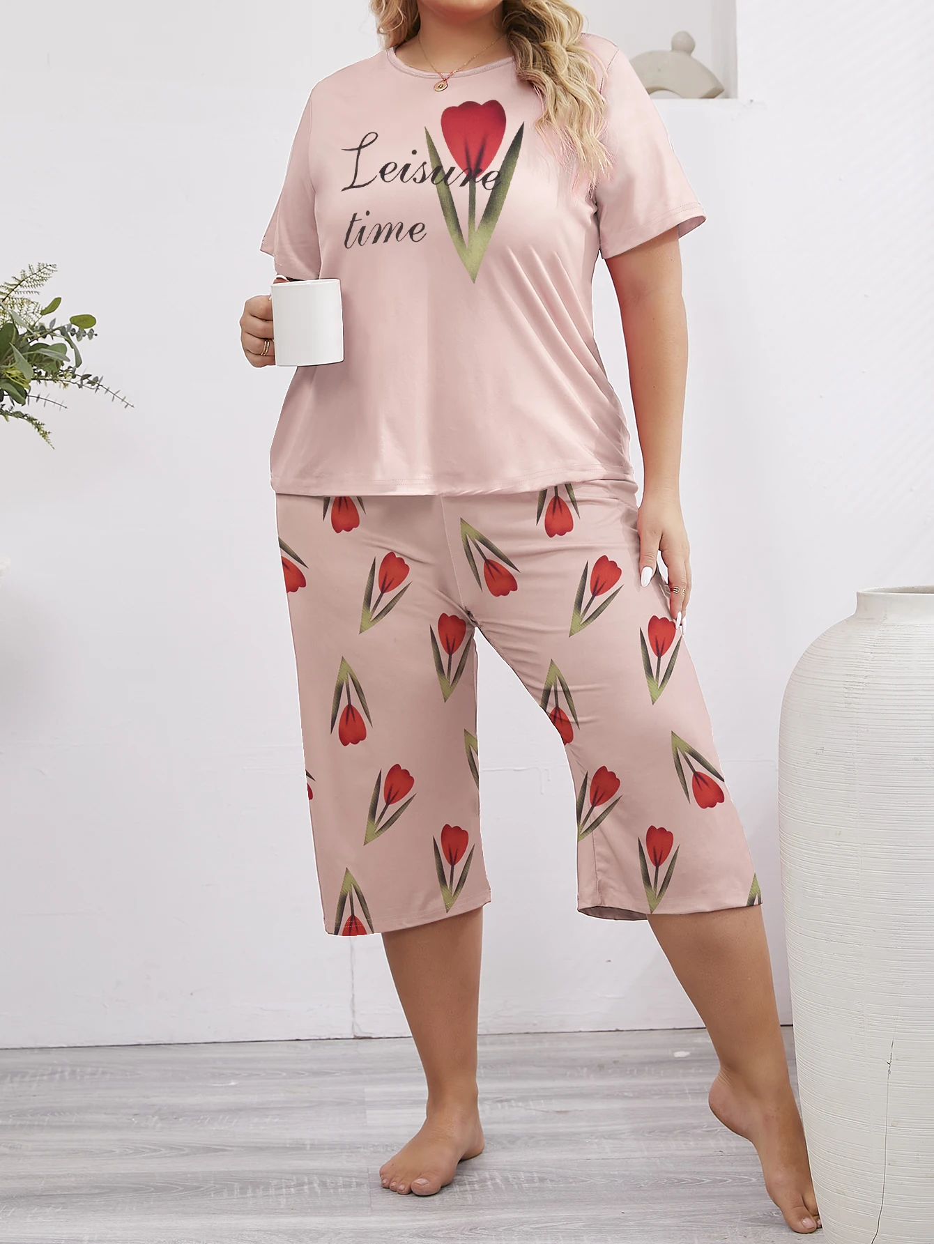 Unwind in comfort and style with this charming plus size sleepwear set. Featuring a soft pink base with vibrant red tulip prints and a “Leisure Time” statement top, this two-piece outfit combines cozy ease with a touch of floral elegance—perfect for lounging or restful sleep.