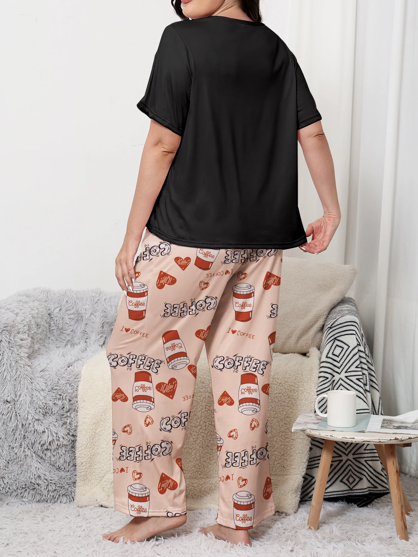 Unwind in style with this charming plus-size sleepwear set, featuring a black short-sleeve top with a playful coffee print and wide-leg cream pants adorned with matching coffee cup and heart patterns. Perfect for lounging or bedtime, this set blends coziness with personality for your nightly routine.